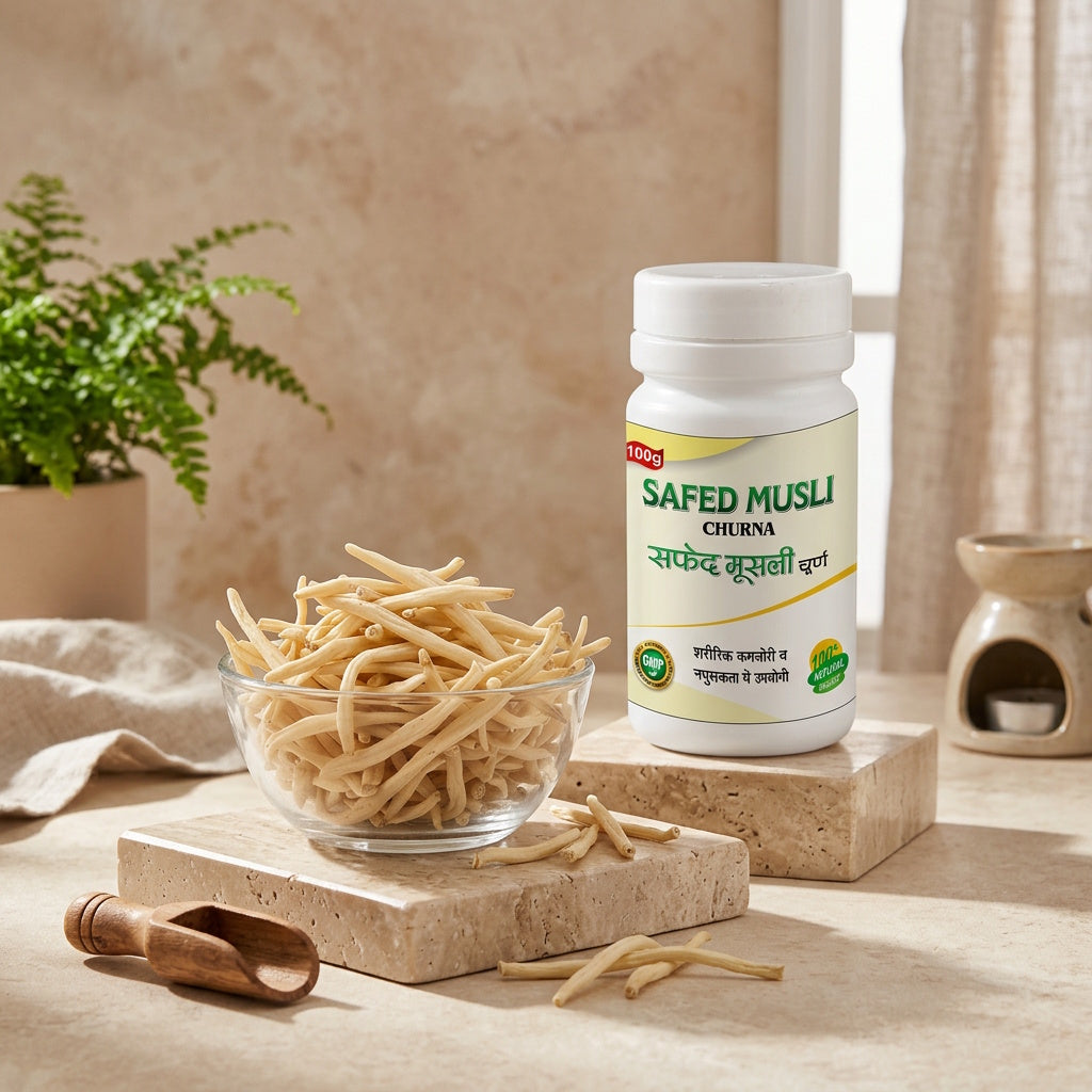 Mix 1-2 teaspoons of Safed Moosli powder with warm milk, water, or your favorite beverage. Consume once daily for best results.