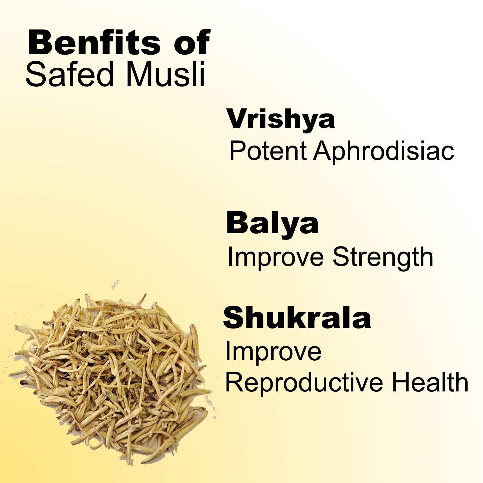 Mix 1-2 teaspoons of Safed Moosli powder with warm milk, water, or your favorite beverage. Consume once daily for best results.