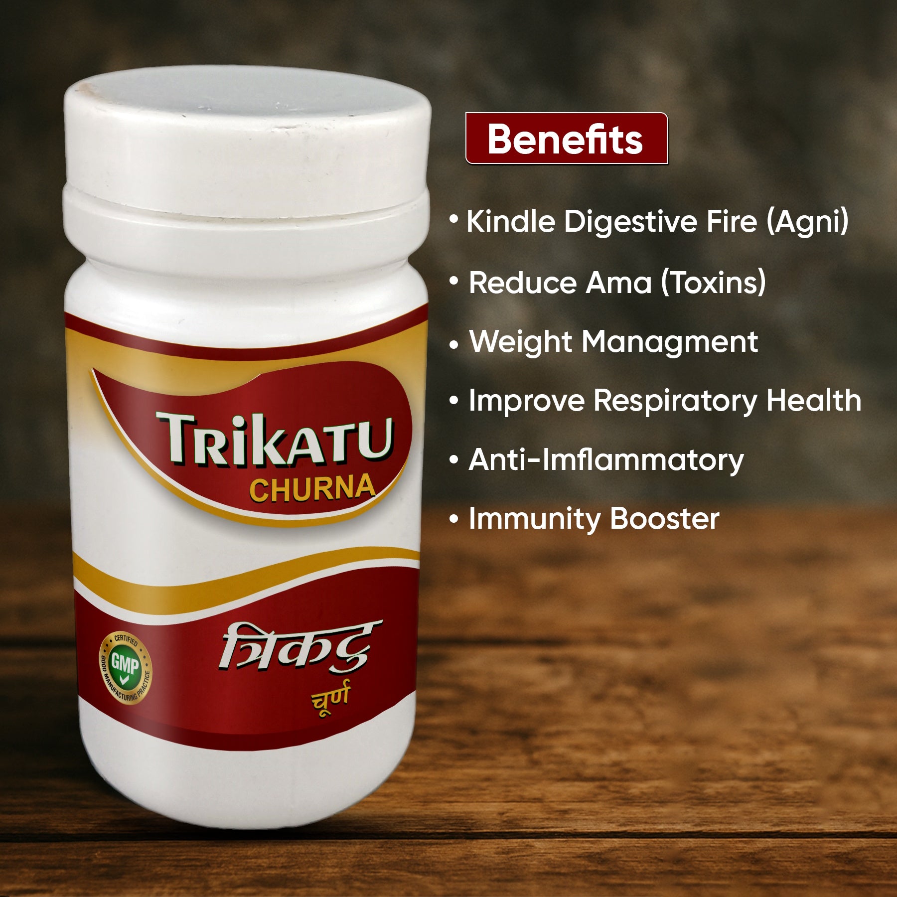 Regular use of Trikatu Churna helps reduce Ama (toxins) in the body, supports healthy weight management, and relieves symptoms of indigestion, sluggishness, and respiratory congestion. Its warming nature makes it especially beneficial during cold and damp seasons.