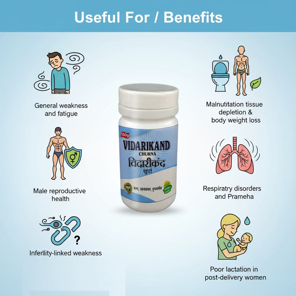 Vidarikand Churna is a sweet, cooling, strength-enhancing, nourishing, reproductive tonic that increases semen and breast milk, supports vitality, and is beneficial in weakness, infertility, urinary disorders, and tissue depletion.